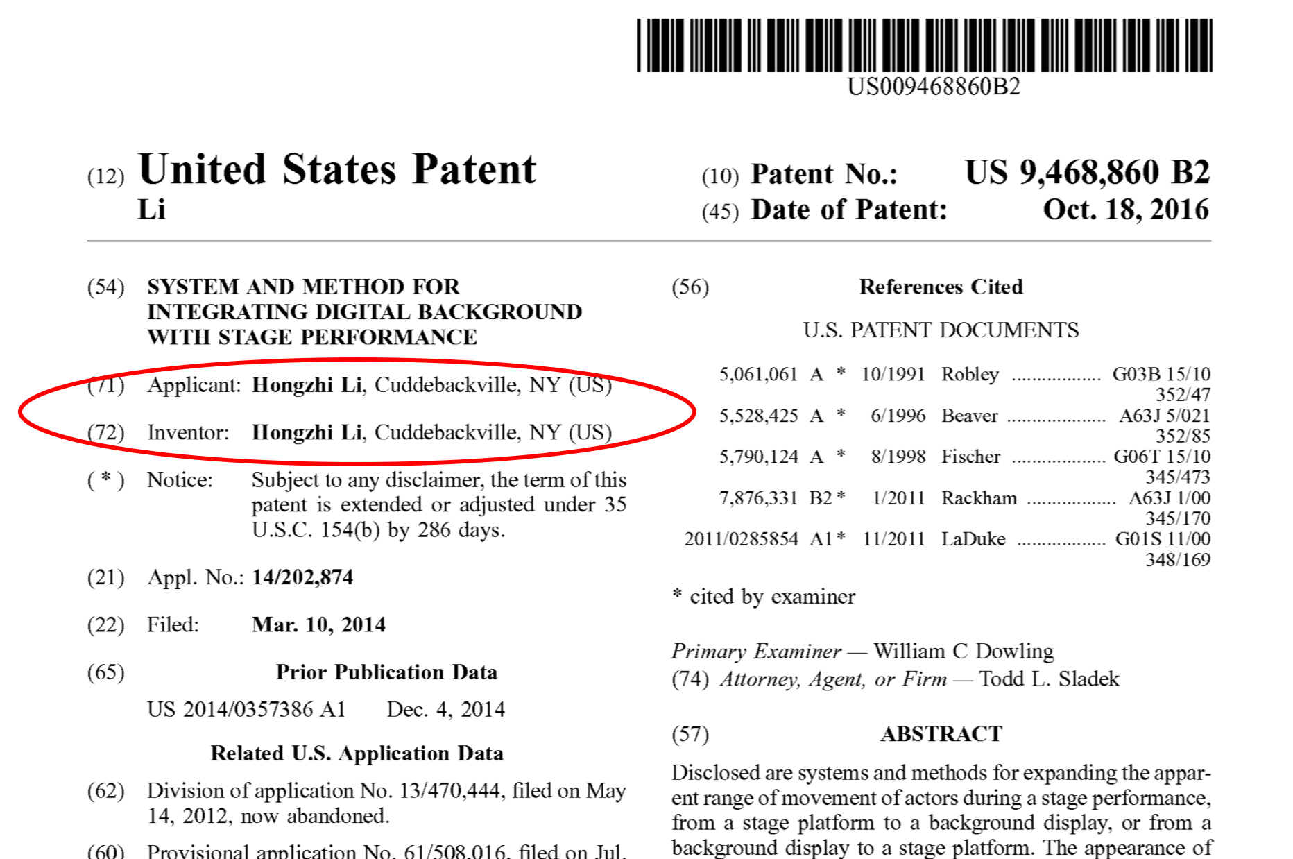 But according to the searchable database of the United States Patent and Trademark Office, the inventor of this “System and method for integrating digital background with stage performance” is none other than “Li Hongzhi, Cuddebackville, NY (US).”