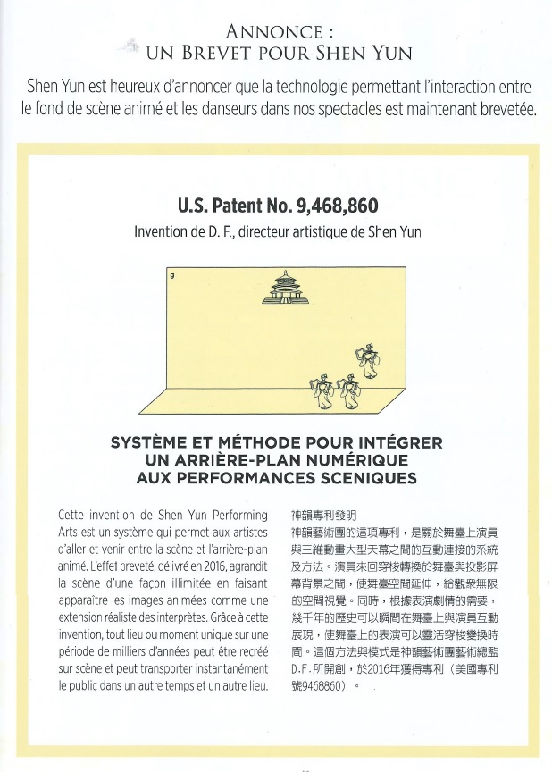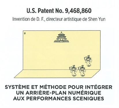 In practice this means that dancers run towards what looks like an enormous television screen, jump and disappear into a trench between the floor and the screen. Right at the moment they vanish, a digital, life-size version of the actor pops up on the screen and flawlessly takes over the actor's movement, with them flying or morphing into a dragon for example. The digital background is patented under “U.S. Patent No. 9,468,860 - invention of D.F., artistic director of Shen Yun.”